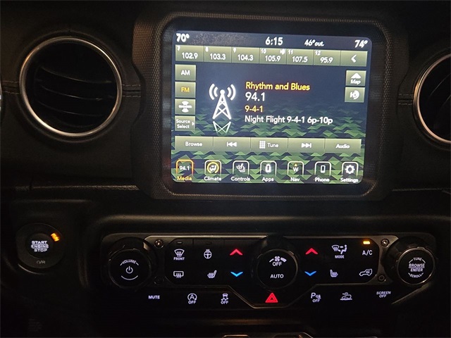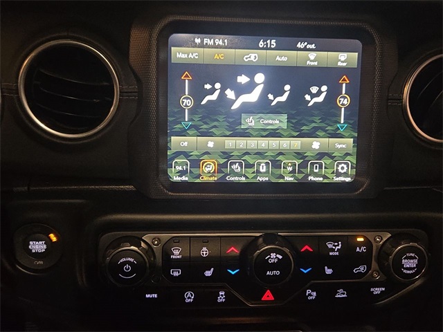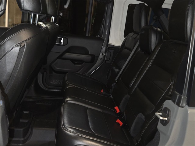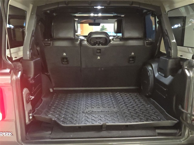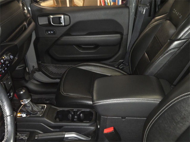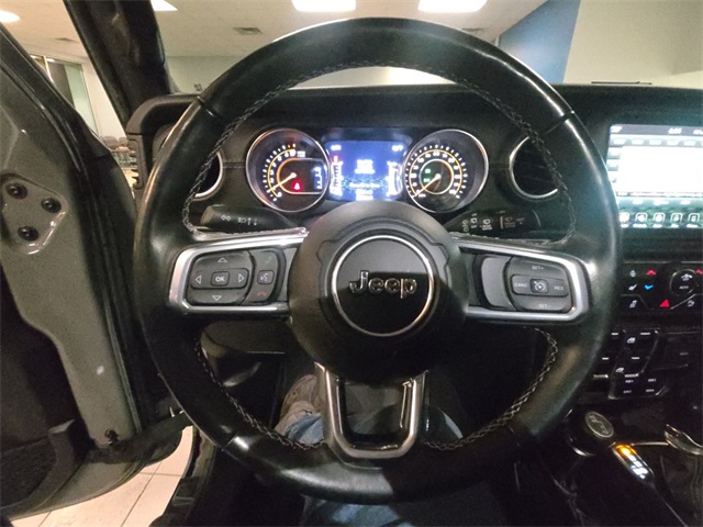 Inside, rugged capability meets refined luxury with **leather-trimmed Sahara bucket seats**, **heated front seats**, **heated steering wheel**, **dual-zone automatic climate control**, and a **premium wrapped instrument panel**. Stay connected with **Uconnect 4C NAV**, an **8.4 touchscreen**, **Apple CarPlay**, **Android Auto**, **SiriusXM**, and a **9-speaker audio system**.