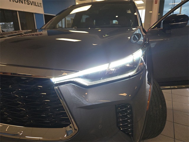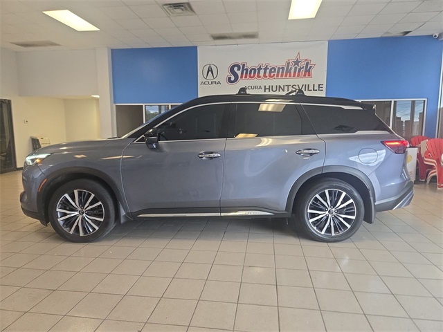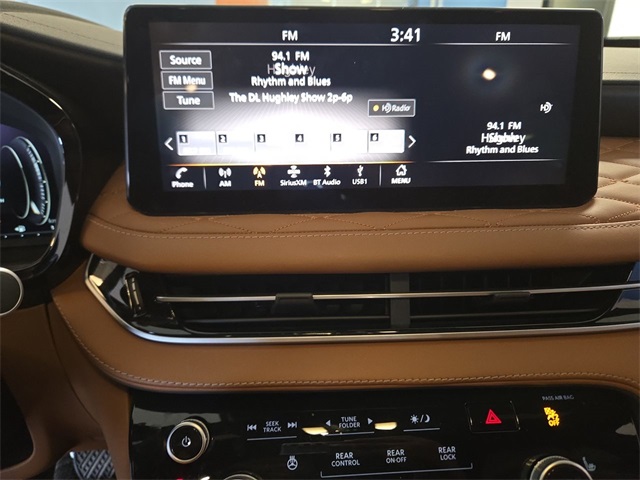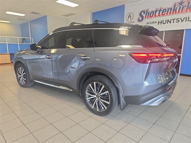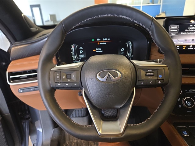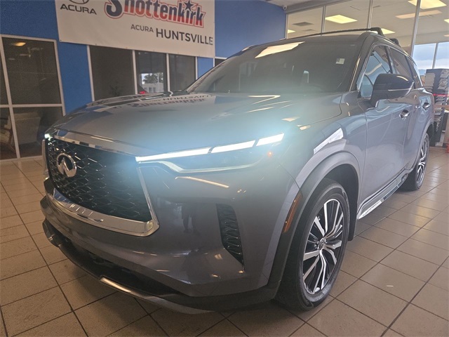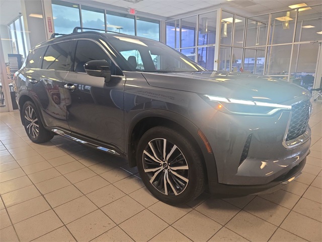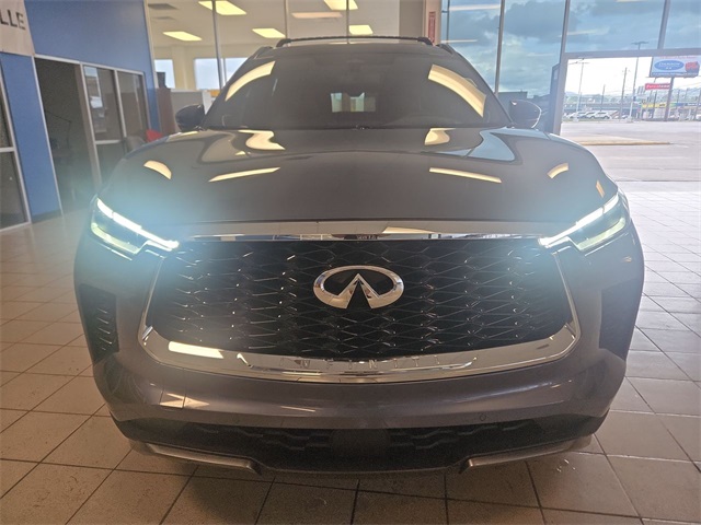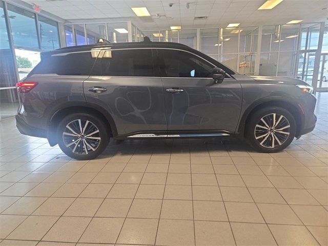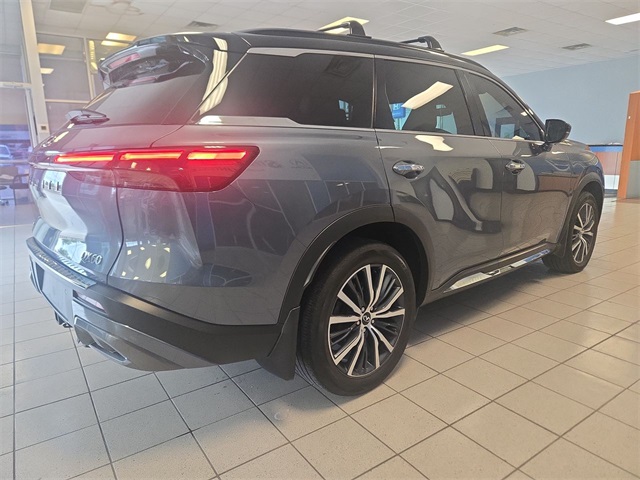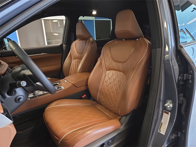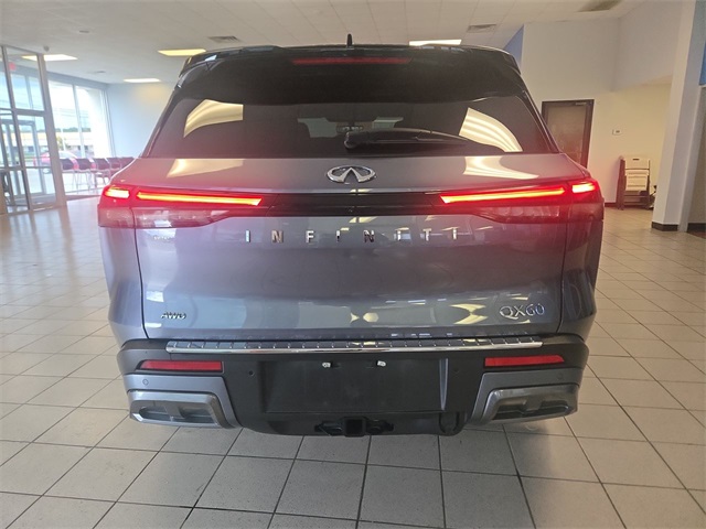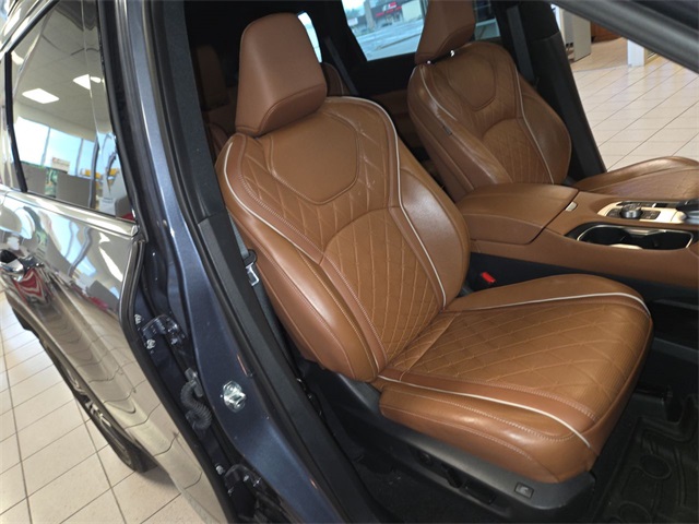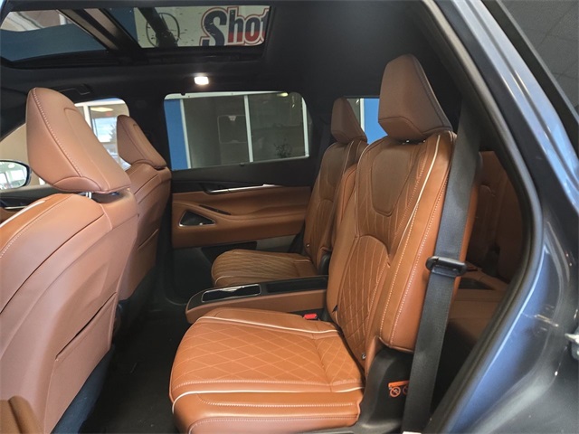 Moonbow Blue/Black Obsidian 2023 INFINITI QX60 Autograph AWD 9-Speed Automatic 3.5L V6 17 Speakers, 3rd row seats: bench, 4-Wheel Disc Brakes, 4.334 Axle Ratio, ABS brakes, Air Conditioning, Alloy wheels, AM/FM radio: SiriusXM, Anti-whiplash front head restraints, Auto High-beam Headlights, Auto-dimming door mirrors, Auto-dimming Rear-View mirror, Automatic temperature control, Black Cross Bar, Bose Performance Series 17-Speaker Sound System, Brake assist, Bumpers: body-color, Cargo Mat (Reversible), Cargo Package, Climate-Controlled Front Bucket Seats, Delay-off headlights, Driver door bin, Driver vanity mirror, Dual front impact airbags, Dual front side impact airbags, Electronic Stability Control, Emergency communication system, First Aid Kit, Floor Mats on Captains Chair w/3rd Row Tray, Four wheel independent suspension, Front anti-roll bar, Front Bucket Seats, Front Center Armrest, Front dual zone A/C, Front reading lights, Fully automatic headlights, Garage door transmitter: HomeLink, Heads-Up Display, Heated door mirrors, Heated front seats, Heated rear seats, Heated steering wheel, Illuminated entry, Illuminated Kick Plate, Knee airbag, Leather Shift Knob, Leather steering wheel, Literature Kit, Low tire pressure warning, Memory seat, Navigation system: INFINITI InTouch Navigation, Occupant sensing airbag, Outside temperature display, Overhead airbag, Overhead console, Panic alarm, Passenger door bin, Passenger vanity mirror, Power door mirrors, Power driver seat, Power Liftgate, Power moonroof, Power passenger seat, Power steering, Power windows, Radio data system, Radio: AM/FM Audio System, Rain sensing wipers, Rear air conditioning, Rear anti-roll bar, Rear reading lights, Rear side impact airbag, Rear window defroster, Rear window wiper, Reclining 3rd row seat, Remote keyless entry, Security system, Semi Aniline Leather Seating Surfaces, Speed control, Speed-sensing steering, Speed-Sensitive Wipers, Splash Guards, Split folding rear seat, Spoiler, Steering wheel memory, Steering wheel mounted audio controls, Tachometer, Telescoping steering wheel, Tilt steering wheel, Traction control, Trip computer, Turn signal indicator mirrors, Variably intermittent wipers, Ventilated front seats, Wheels: 20" x 8J Luxury Machined Aluminum Alloy.