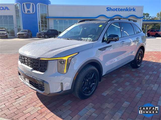 CARFAX One-Owner. 2024 Kia Sorento X-Pro SX Prestige X-Pro SX Prestige Wolf Gray 4D Sport Utility 2.5L I4 DGI Turbocharged DOHC 16V LEV3-SULEV30 281hp 8-Speed DCT AWD This vehicle comes well equipped with 12 Speakers, 3.316 Axle Ratio, 3rd row seats: split-bench, 4-Wheel Disc Brakes, ABS brakes, Air Conditioning, Alloy wheels, AM/FM radio: SiriusXM, Apple CarPlay & Android Auto, Auto High-beam Headlights, Auto-dimming Rear-View mirror, Automatic temperature control, Brake assist, Bumpers: body-color, Carpeted Cargo Mat w/Seatback Protection, Carpeted Floor Mats, Cross Bars X-Line, Delay-off headlights, Driver door bin, Driver vanity mirror, Dual front impact airbags, Dual front side impact airbags, Electronic Stability Control, Emergency communication system: 911 Connect, Exterior Parking Camera Rear, Four wheel independent suspension, Front anti-roll bar, Front Bucket Seats, Front Center Armrest, Front dual zone A/C, Front fog lights, Front reading lights, Fully automatic headlights, Garage door transmitter: HomeLink, Heated & Ventilated Front Bucket Seats, Heated door mirrors, Heated front seats, Heated rear seats, Heated steering wheel, Illuminated entry, Knee airbag, Leather steering wheel, Low tire pressure warning, Memory seat, Navigation System, Occupant sensing airbag, Outside temperature display, Overhead airbag, Overhead console, Panic alarm, Passenger door bin, Passenger vanity mirror, Perforated Genuine Leather Seat Trim, Power door mirrors, Power driver seat, Power Liftgate, Power moonroof, Power passenger seat, Power steering, Power windows, Radio data system, Radio: AM/FM Bose Premium Audio System, Rain sensing wipers, Rear anti-roll bar, Rear reading lights, Rear side impact airbag, Rear window defroster, Rear window wiper, Remote keyless entry, Security system, Smart Key w/ Push Button and Remote Start, Speed control, Speed-sensing steering, Split folding rear seat, Spoiler, Steering wheel mounted audio controls, Tachometer, Telescoping steering wheel, Textured Rear Bumper Applique, Tilt steering wheel, Traction control, Trip computer, Turn signal indicator mirrors, Variably intermittent wipers, Ventilated front seats, and Wheels: 7.0J x 17" Gloss Black X-Pro Alloy.